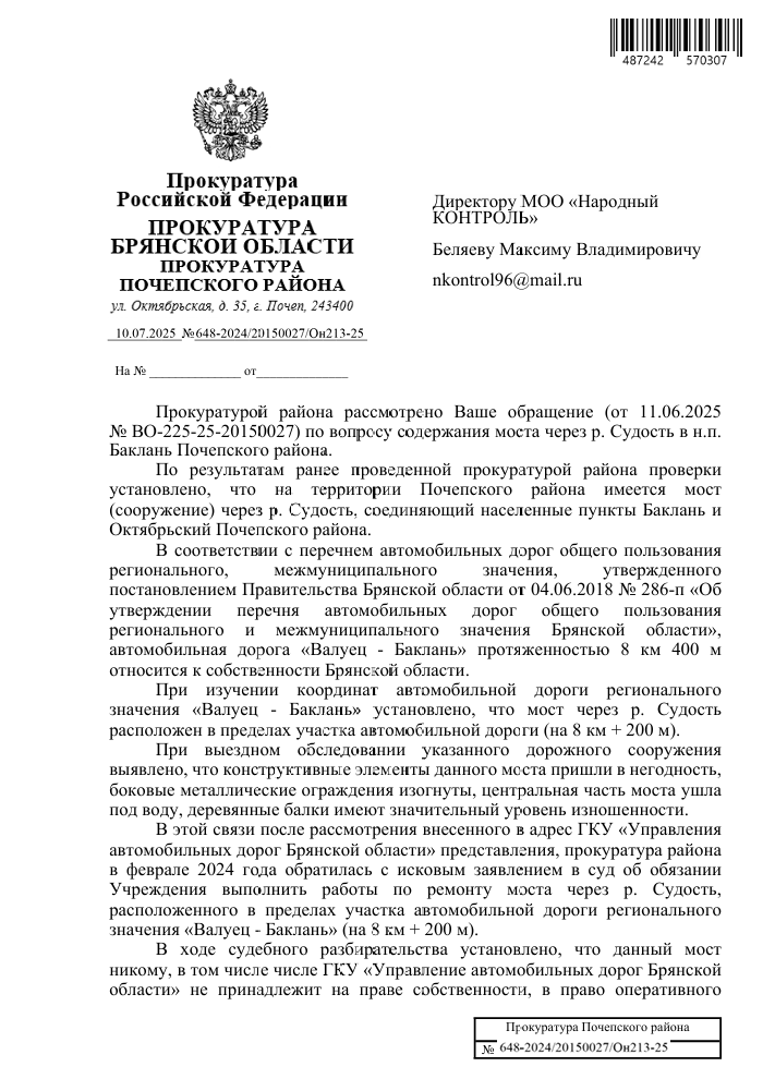 В начале июня из Почепского района Брянской области было получено обращение о разрушенном мосте через реку Судость, соединяющем участки региональной автодороги «Валуец — Баклань». По словам местных жителей, переправа находится в аварийном состоянии уже три года, из-за чего дорога фактически разорвана на две части. Обращение касалось необходимости ремонта моста и привлечения к ответственности службы, отвечающей за его содержание.