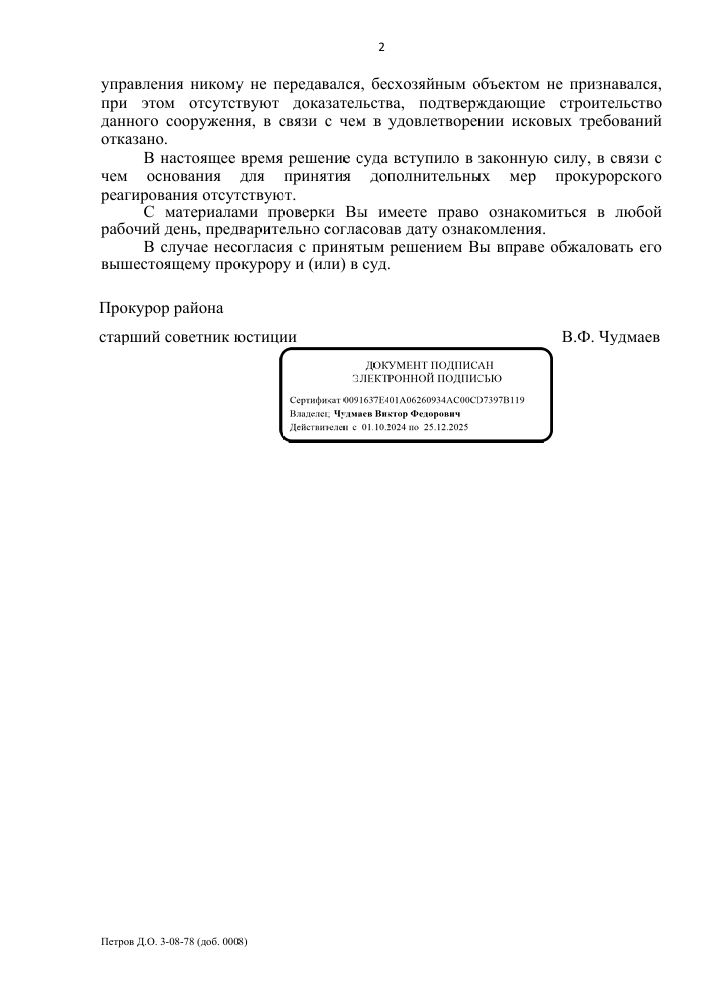 Однако, как следует из ответа прокуратуры, несмотря на очевидные разрушения конструкций и угрозу безопасности, судебное разбирательство по инициативе надзорного ведомства не дало результата. Причина — отсутствие собственника моста: сооружение официально никому не принадлежит, не передавалось в управление и не признано бесхозяйным. В результате суд отказал в удовлетворении иска, и, как заявили в прокуратуре, оснований для дальнейших мер нет.