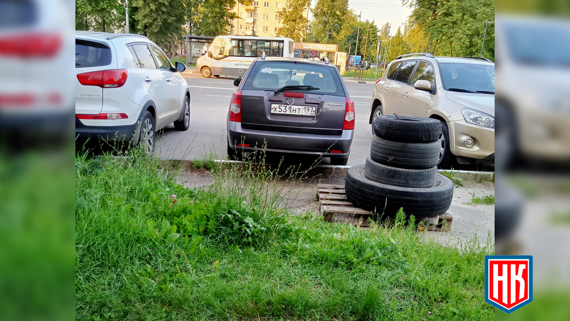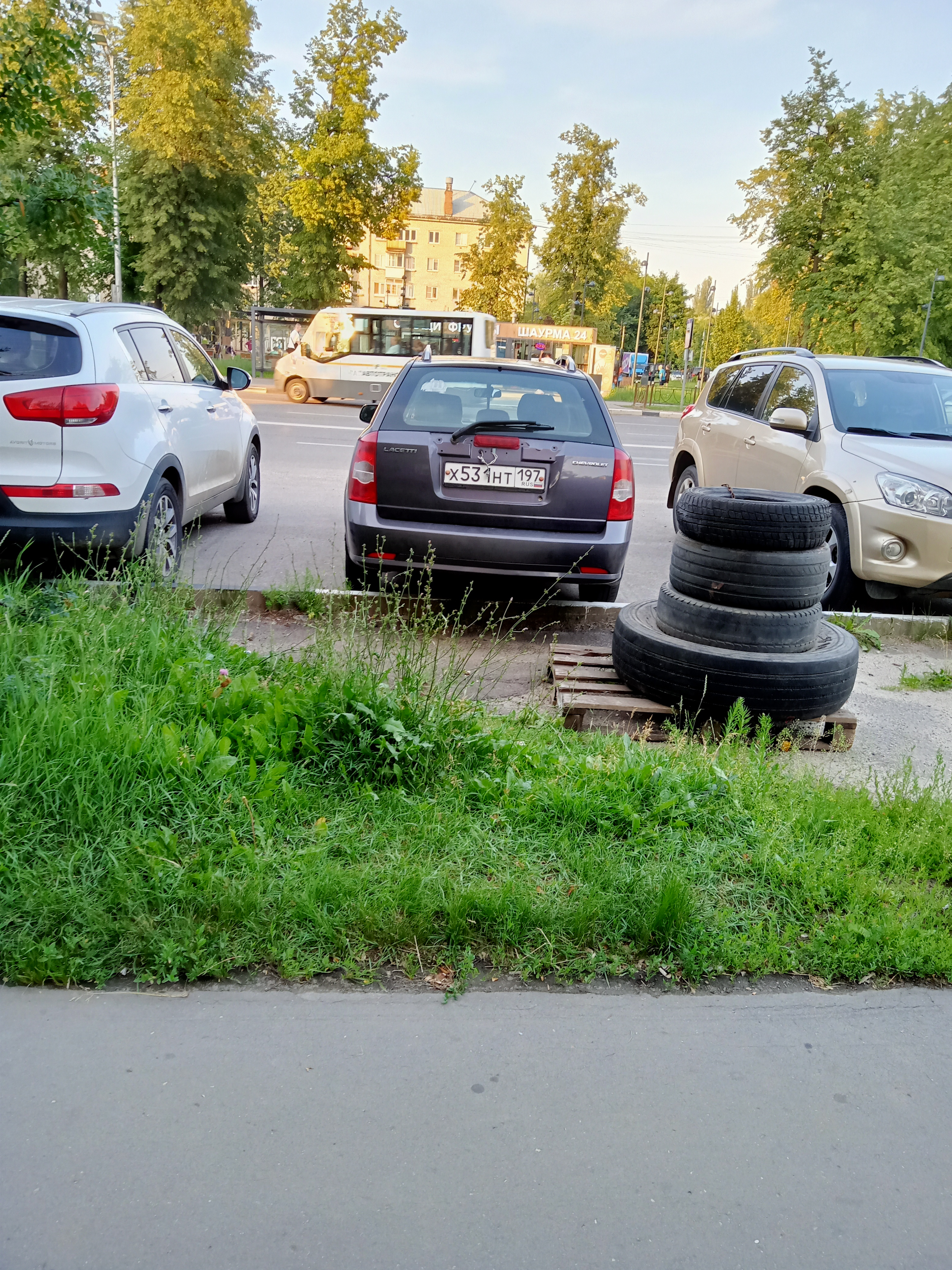 Электросталь, проспект Ленина, 6. Парковочный карман. Автолюбитель выкладывает пирамиду из старых покрышек, решив, что это его бесплатное место, а когда ему стали говорить, что так нельзя, что вы тут устроили, он повёл себя агрессивно. Может нам тогда всем себе по месту отжать? Там ведь ещё и МФЦ, куда приезжают люди. И это безобразие уже полгода.