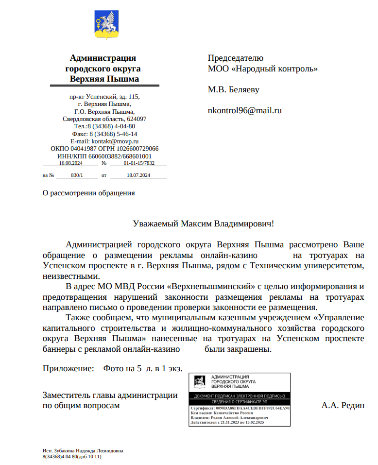 Администрацией городского округа Верхняя Пышма рассмотрено Ваше обращение о размещении рекламы онлайн-казино ** на тротуарах на Успенском проспекте в г. Верхняя Пышма, рядом с Техническим университетом, неизвестными.
