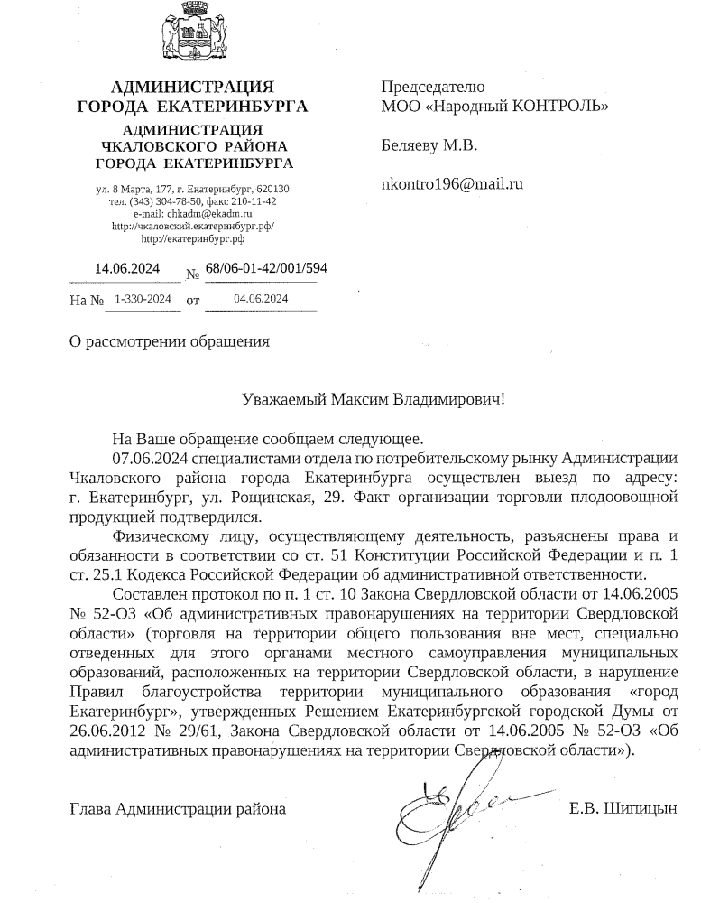 Публикуем ранее поступивший ответ по обращению жителей города Екатеринбурга по вопросу незаконной торговой точки по ул. Рощинская.