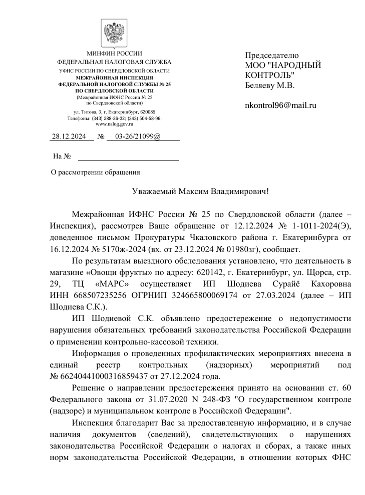 Прокуратура Чкаловского района передала дело в Межрайонную ИФНС № 25 по Свердловской области. В результате выездной проверки инспекция установила, что торговлю на указанной территории ведет ИП Шодиева Сурайё Кахоровна. Ей было объявлено официальное предостережение о недопустимости нарушений законодательства, в частности требований по применению контрольно-кассовой техники. Информация о проведенных профилактических мерах внесена в реестр контрольных мероприятий.