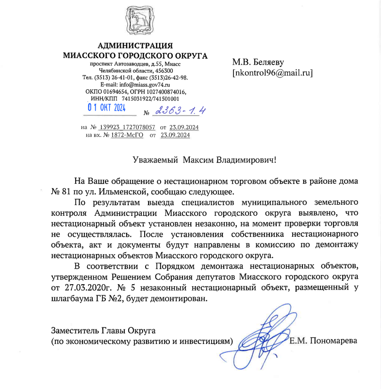 В ответ на обращение граждан о незаконно установленном нестационарном торговом объекте в районе дома № 81 по ул. Ильменской в Миассе, представители муниципального земельного контроля провели проверку. В ходе выезда выяснили, что данный объект был установлен без необходимых разрешений и на момент проверки не осуществлял торговлю.
