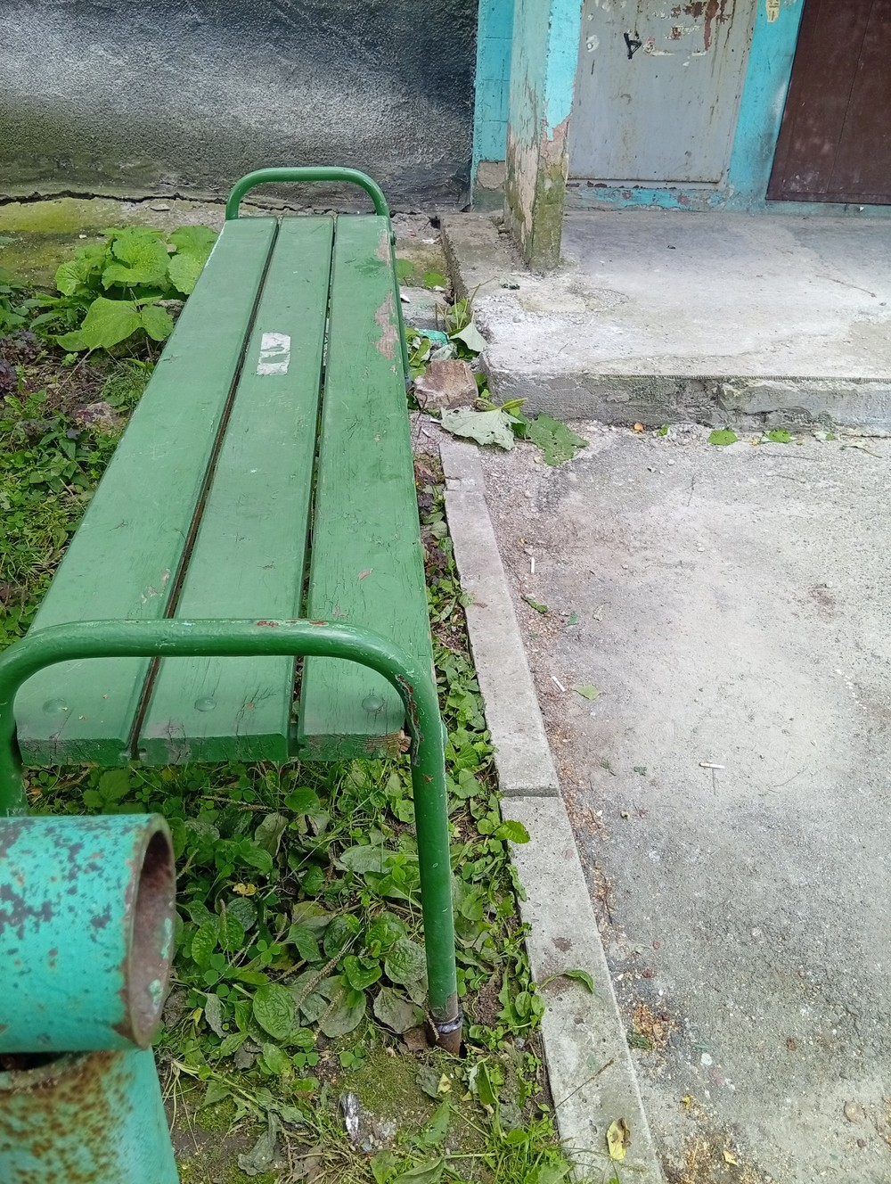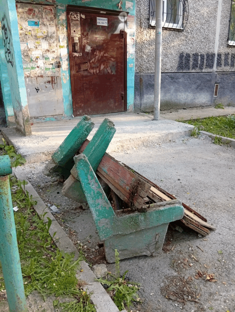 У подъезда с основания дома была скамейка. Со временем ей потребовались покраска и небольшой ремонт. Вместо этого скамейку просто разрушили, а затем убрали. После многочисленных (!) просьб о восстановлении скамейки, в том числе и обращений в Департамент ГосЖилИнспекции и Прокуратуру, её восстановили. Но на другом месте, рядом со старым местоположением, на газоне.