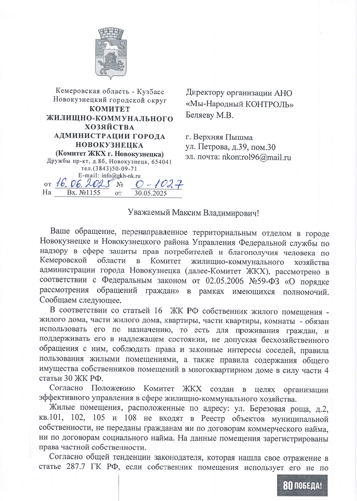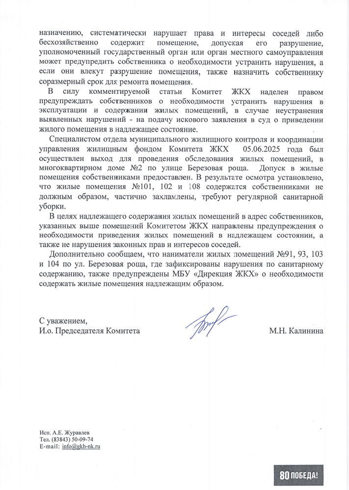 В недавно полученном ответе от 16 июня администрация города отчиталась о результатах проверки, проведённой Комитетом ЖКХ. Установлено, что квартиры №101, 102 и 108 частично захламлены и требуют санитарной уборки. Собственникам направлены официальные предупреждения. Аналогичные меры приняты в отношении нанимателей квартир №91, 93, 103 и 104.