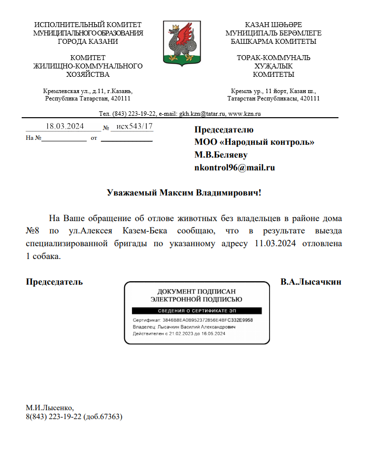 Публикуем ранее поступивший ответ по обращению жителей города Казани по вопросу бродячих собак по улице Казем-Бека. Обращение приложено ниже: