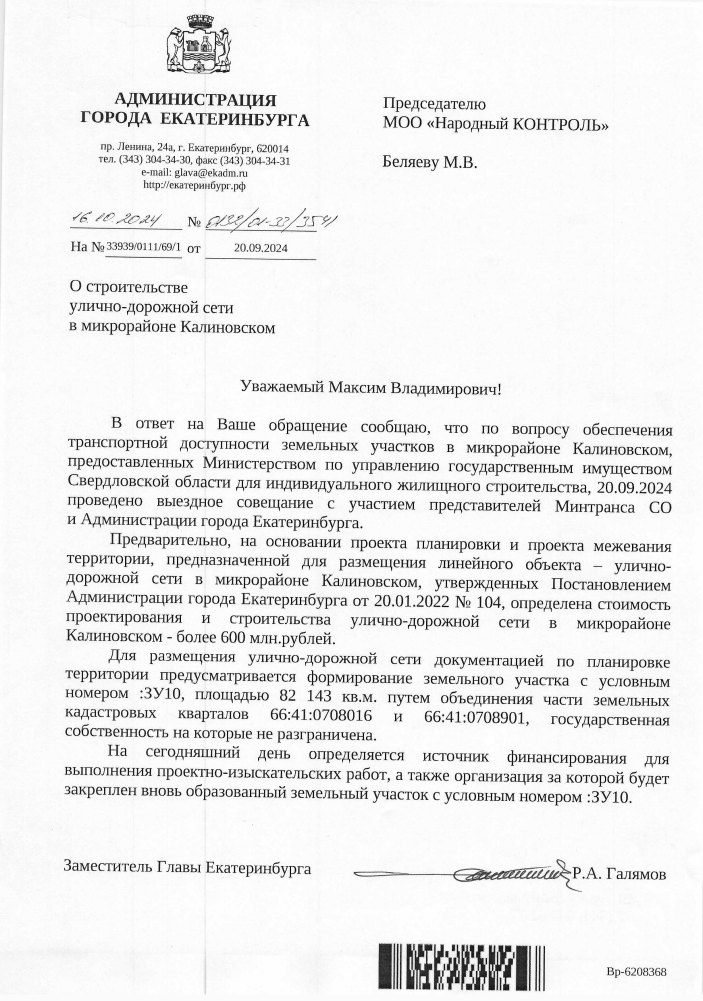 Ответ сообщил, что 20 сентября 2024 года состоялось выездное совещание с участием представителей Министерства транспорта Свердловской области и Администрации Екатеринбурга. В ходе совещания были рассмотрены вопросы проектирования и строительства улично-дорожной сети.