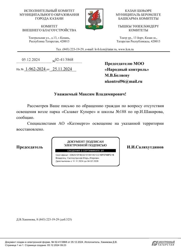 После подачи обращения в соответствующие службы, в том числе в АО «Казэнерго», был получен официальный ответ. В нем сообщается, что специалисты компании уже провели необходимые работы, и освещение на указанной территории было восстановлено.
