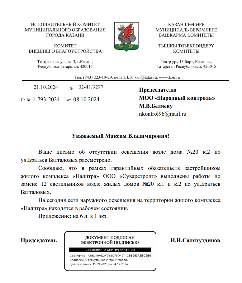 1 октября 2024 года житель Казани обратился с жалобой на отсутствие освещения во дворе дома №20, корпус 2 по улице Братьев Батталовых. В обращении он указал, что фонари во дворе не работают уже полгода, что вызывает серьезные неудобства для всех проживающих.