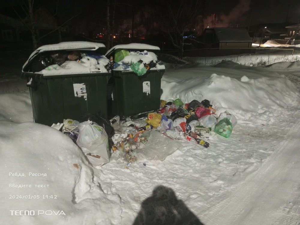 06.01.2024 г. Город Ревда, Свердловская область. ул. Сороковая- первые два фото.( Мусор лежит и не вывозился ещё до Нового года, сегодня 6 января, ситуация не поменялась усугубилась) ул. Революции- третье фото, два контейнера( переполнены и не вывозятся) Перекресток ул. Камаганцев — Красноармейская — четвертое фото (с 31 декабря мусор не вывозится, и очень много лежит мусора под снегом) Совхоз Ревдинский ул.Береговая, 20 — пятое фото (куча мусора скопилась за праздники, звонили диспетчеру ТБО «Экосервис», трубку никто не берёт. Жители жалуются, что региональный оператор по вывозу твердых коммунальных отходов, ещё до праздников забыл про частный сектор, праздники уже заканчиваются, а мусор как лежал так и продолжает лежать. Возле помоек царит настоящий ужас. Мусор растаскивают собаки и птицы. Просим Народный контроль помочь и заставить регоператора, исполнять свои прямые обязанности, согласно заключённому контракту. С уважением жители города Ревда.