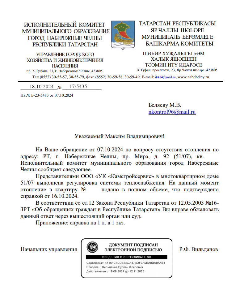 На обращение был получен ответ от Исполнительного комитета города Набережные Челны.