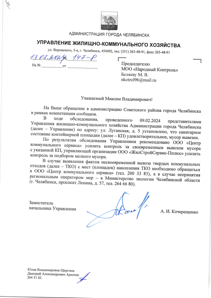 Ответ администрации Челябинска по вопросу вывоза мусора на Луганской