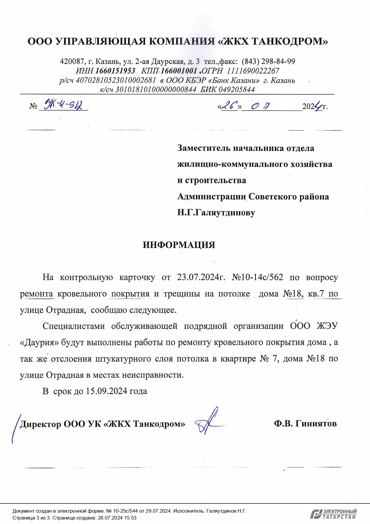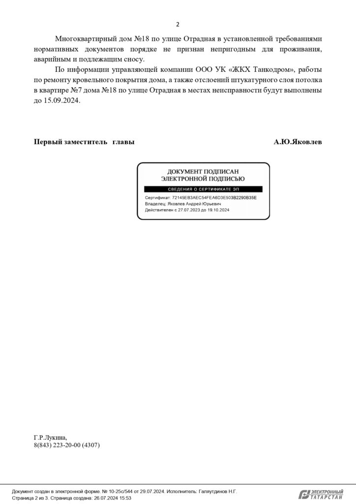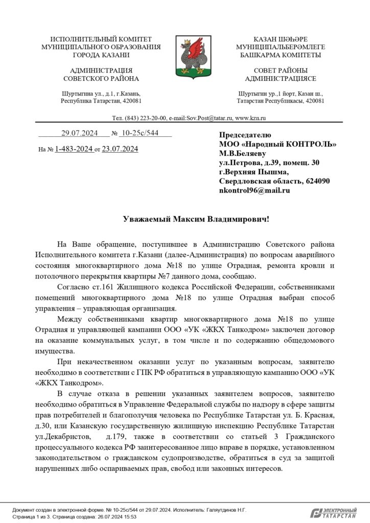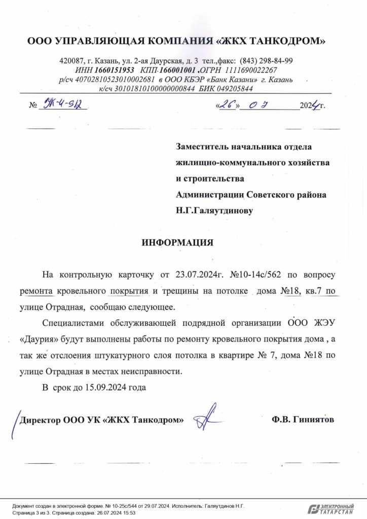 Ответ Администрации по вопросу ремонта потолочного покрытия в доме по ул. Отрадной в Казани