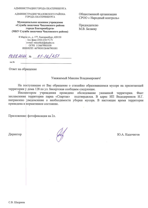 Ответ Администрации по вопросу уборки территории парка за Теннисной академией в Екатеринбурге