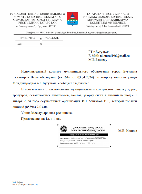 Исполнительный комитет муниципального образования город Бугульма рассмотрев Ваше обращение (вх.164-г от 03.04.2024) по вопросу очистки улицы Международная в г. Бугульма, сообщает следующее.
