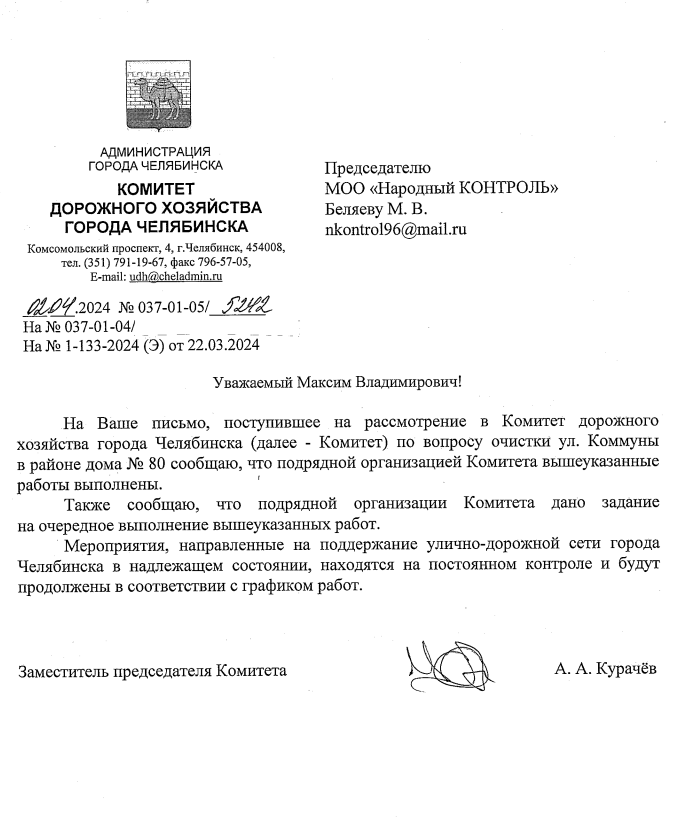 На Ваше письмо, поступившее на рассмотрение в Комитет дорожного хозяйства города Челябинска (далее — Комитет) по вопросу очистки ул. Коммуны в районе дома № 80 сообщаю, что подрядной организацией Комитета вышеуказанные работы выполнены. `