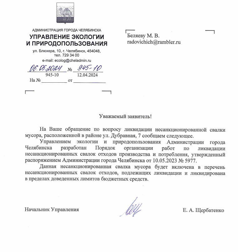 Публикуем ранее поступивший ответ по обращению жителей города Челябинск по вопросу незаконной свалки по ул. Дубравная.
