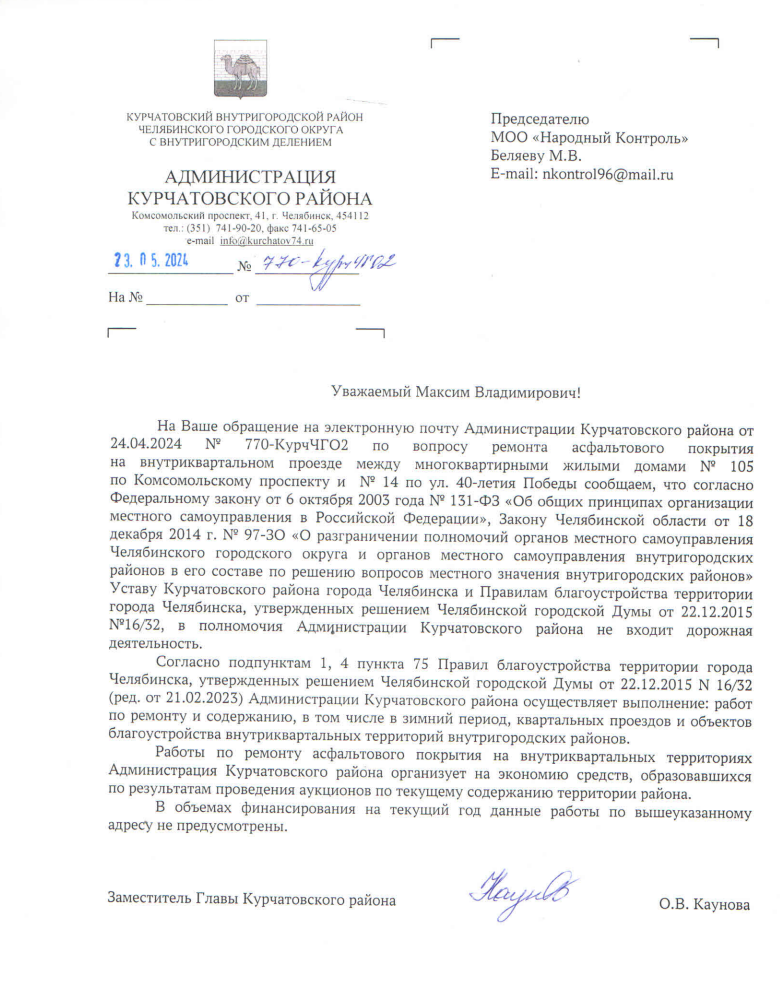 На ваше обращение от 24.04.2024 № 770-КурчЧГО2 по ремонту асфальтового покрытия сообщаем, что дорожная деятельность не входит в полномочия Администрации Курчатовского района.