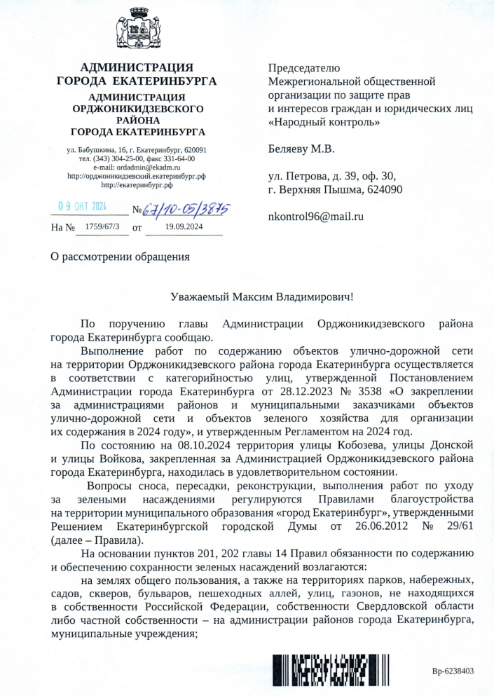 В сентябре в МОО «Народный Контроль» поступило обращение из Екатеринбурга. Жительница Эльмаша обратилась из-за проблем с благоустройством района, где не производилась уборка улиц Кобозева, Донской и Войкова. Она неоднократно обращалась в администрацию, но получала лишь отписки о «удовлетворительном состоянии».