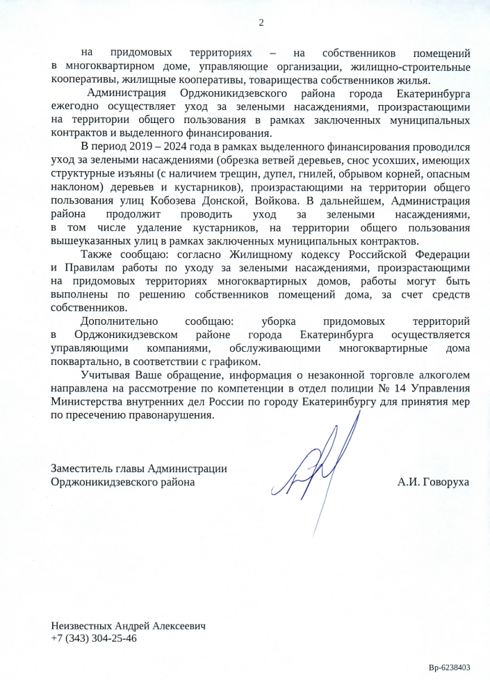 Ответ также сообщает, что работы по уходу за зелёными насаждениями на придомовых территориях многоквартирных домов могут быть выполнены только по решению собственников помещений этих домов и за их счёт, согласно Жилищному кодексу РФ. Также добавлено, что уборка придомовых территорий в Орджоникидзевском районе Екатеринбурга производится управляющими компаниями, которые обслуживают многоквартирные дома.