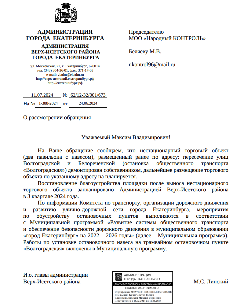 Ответ из Екатеринбурга по вопросу благоустройства остановки «Волгоградская»