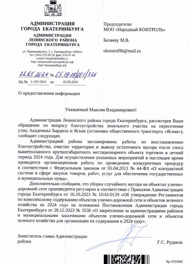 Публикуем ранее поступивший ответ по обращению жителей города Екатеринбург по вопросу благоустройства территории после сноса киоска на перекрестке Ясная — Бардина.