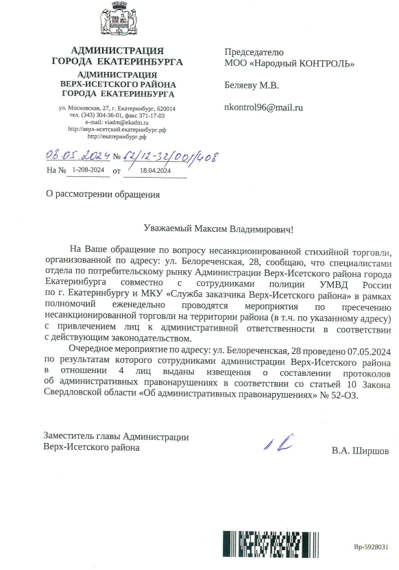 На Ваше обращение по вопросу несанкционированной стихийной торговли, организованной по адресу: ул. Белореченская, 28, сообщаю, что специалистами отдела по потребительскому рынку Администрации Верх-Исетского района города Екатеринбурга совместно с сотрудниками полиции УМВД России по г. Екатеринбургу и МКУ «Служба заказчика Верх-Исетского района» в рамках полномочий еженедельно проводятся мероприятия по пресечению несанкционированной торговли на территории района (в т.ч. по указанному адресу) с привлечением лиц к административной ответственности в соответствии с действующим законодательством.