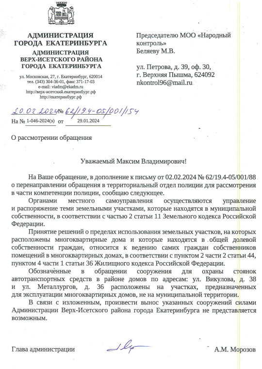 Ответ из Екатеринбурга по вопросу незаконных охранных будок по ул. Викулова и ул. Металлургов