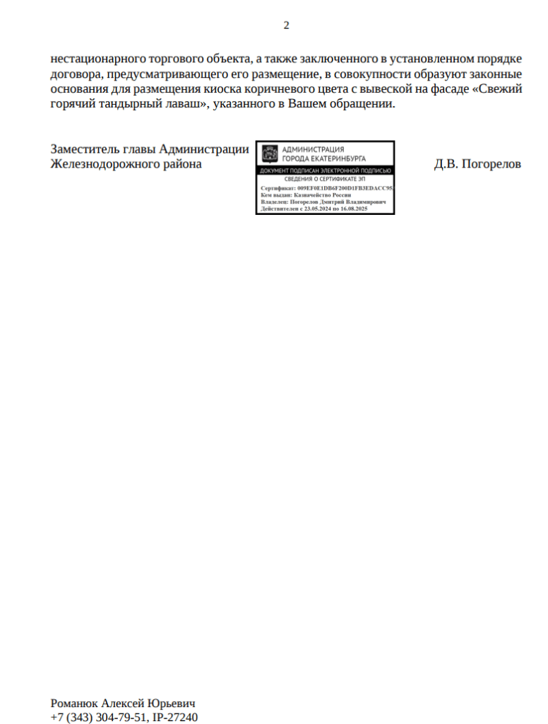 Публикуем ранее поступивший ответ по обращению жителей города Екатеринбург по вопросу законности установки тандырной на перекрестке улицы Надеждинская и проспекта Седова.