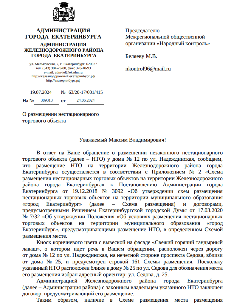Публикуем ранее поступивший ответ по обращению жителей города Екатеринбург по вопросу законности установки тандырной на перекрестке улицы Надеждинская и проспекта Седова.