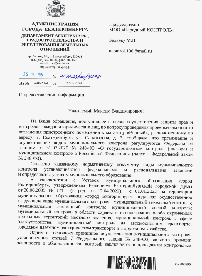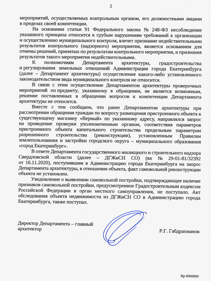 Ответ из Екатеринбурга по вопросу правомерности пристройки к магазину «Верный» на ул. Санаторная