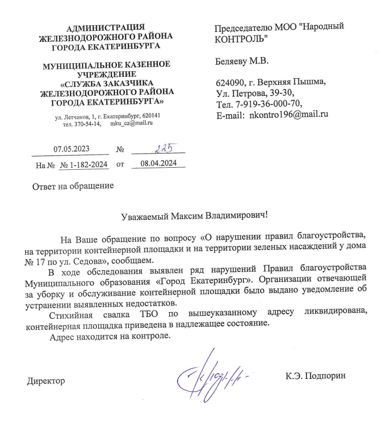 Ответ из Екатеринбурга по вопросу свалки на ул. Седова