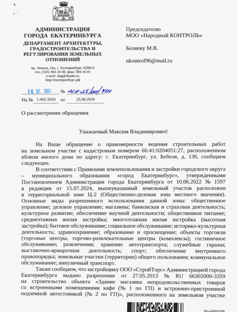 Публикуем ранее поступивший ответ по обращению жителей города Екатеринбург по вопросу законности строительства здания напротив Таганского ряда.