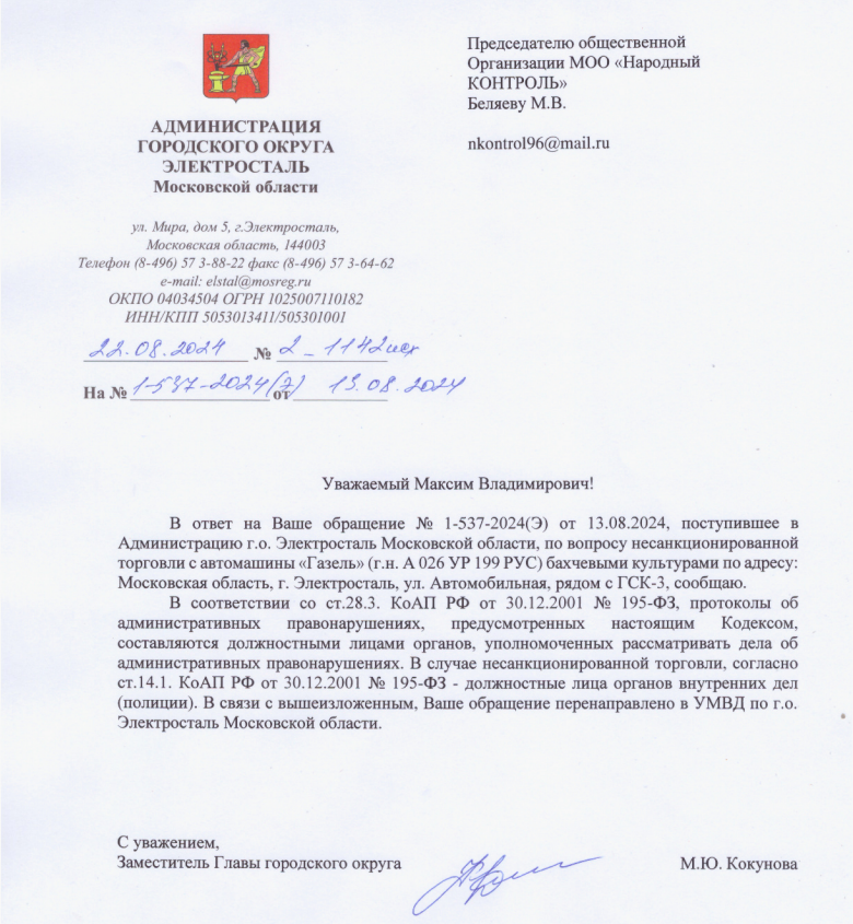 В ответ на Ваше обращение № 1-537-2024(9) от 13.08.2024, поступившее в Администрацию г.о. Электросталь Московской области, по вопросу несанкционированной торговли с автомашины «Газель» (г.н. А 026 УР 199 РУС) бахчевыми культурами по адресу: Московская область, г. Электросталь, ул. Автомобильная, рядом с ГСК-3, сообщаю.