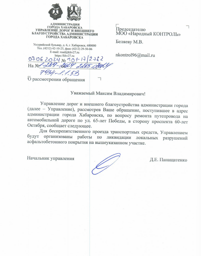 Управление дорог и внешнего благоустройства администрации города (далее — Управление), рассмотрев Ваше обращение, поступившее в адрес администрации города Хабаровска, по вопросу ремонта путепровода на автомобильной дороге по ул. 65-лет Победы, в сторону проспекта 60-лет Октября, сообщает следующее.