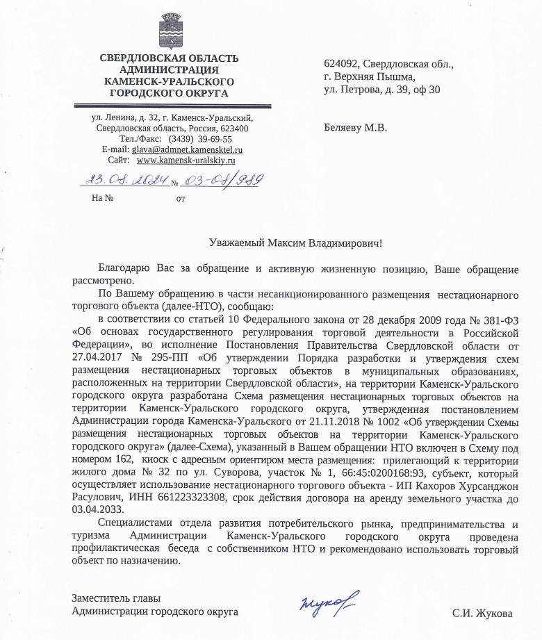 Публикуем ранее поступивший ответ по обращению жителей города Каменск-Уральский Свердловской области по вопросу несанкционированной торговли на ул. Суворова.