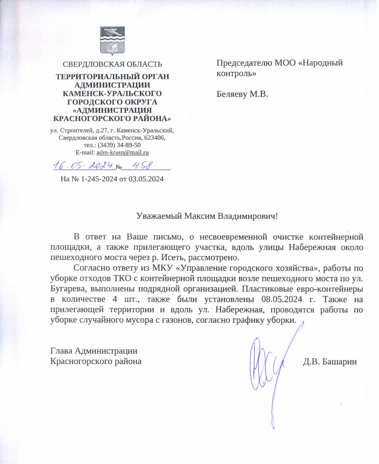Публикуем ранее поступивший ответ по обращению жителей города Каменск-Уральский Свердловской области по вопросу невывоза мусора на берегу реки Исеть.