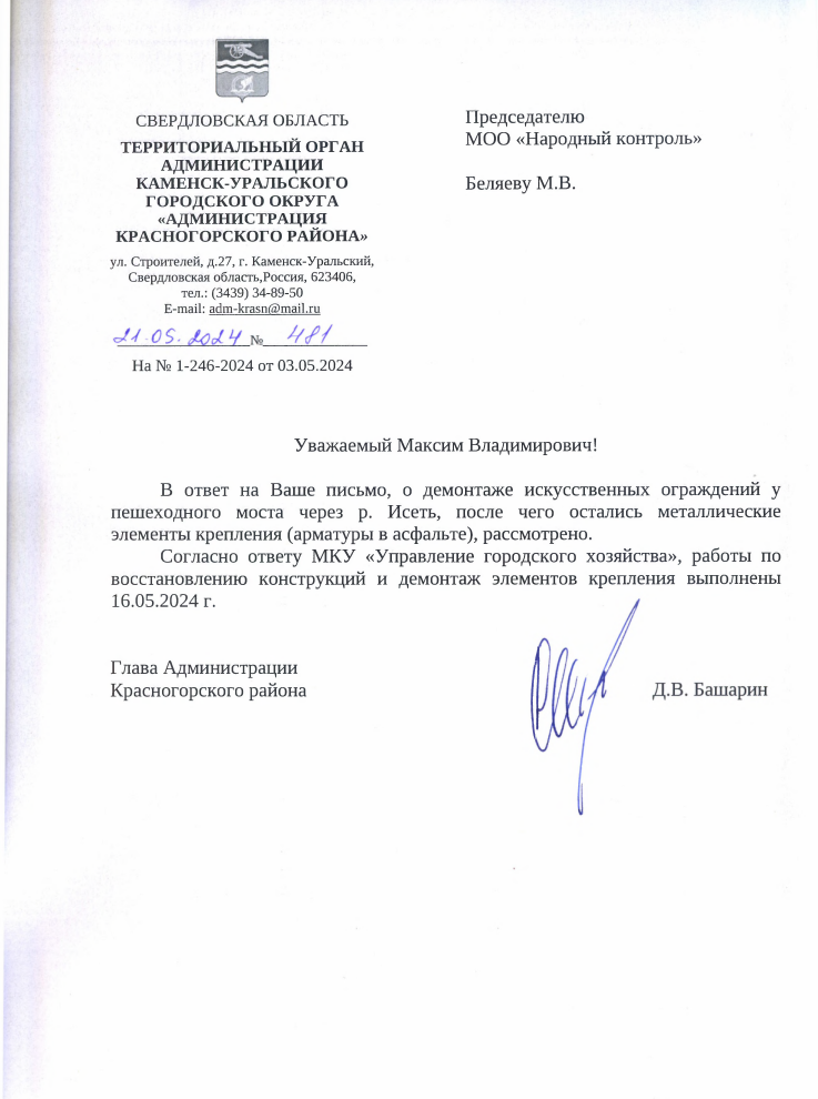 Ответ из Каменска-Уральского по вопросу восстановления дороги вблизи Бугаревского моста