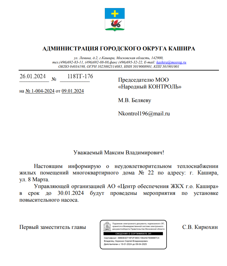 Публикуем ранее поступивший ответ по обращению жителей города Кашира Московской области по вопросу отсутствия отопления по улице 8 Марта, 22.
