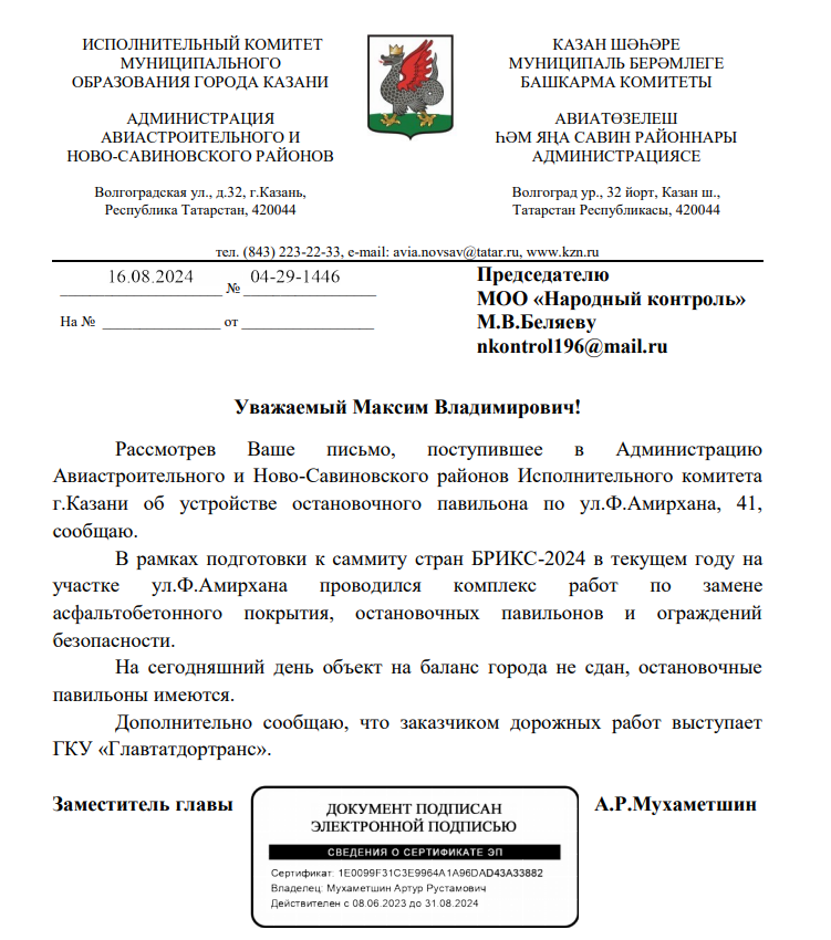 Ответ из Казани по вопросу благоустройства остановки по ул. Амирхана
