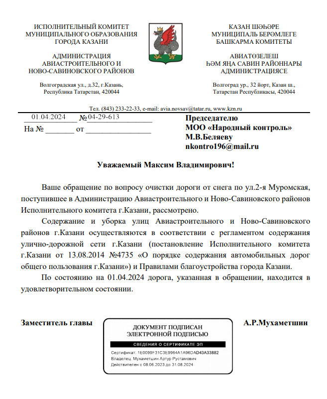 Ответ из Казани по вопросу чистки дороги на Второй Муромской