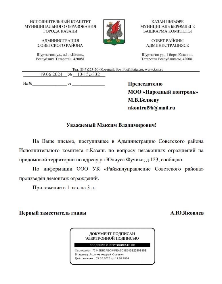 Ответ из Казани по вопросу ограждения придомовой территории для парковки на ул. Фучика