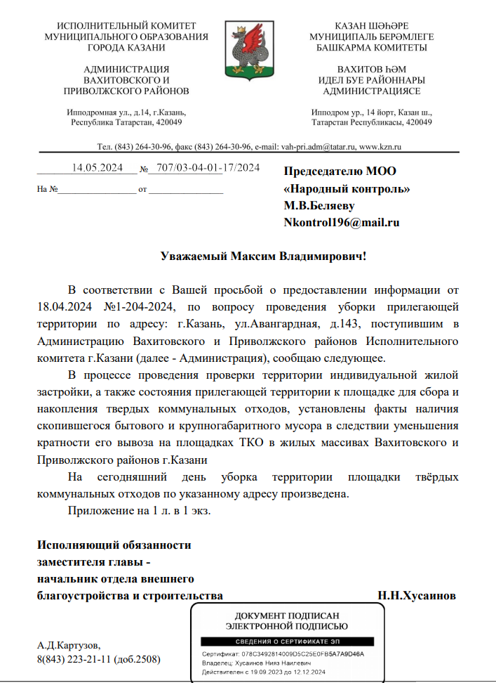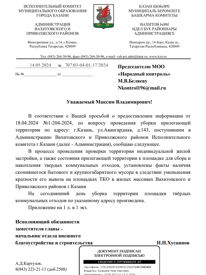В соответствии с Вашей просьбой о предоставлении информации от 18.04.2024 №1-204-2024, по вопросу проведения уборки прилегающей территории по адресу: г.Казань, ул.Авангардная, д.143, поступившим в Администрацию Вахитовского и Приволжского районов Исполнительного комитета г.Казани (далее — Администрация), сообщаю следующее.