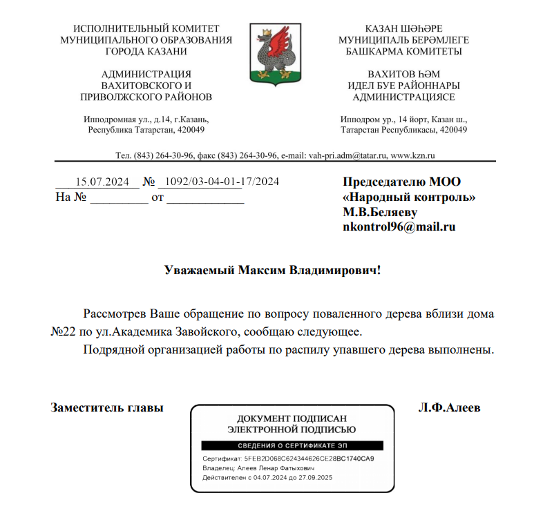 Ответ из Казани по вопросу упавшего дерева по ул. Академика Завойского
