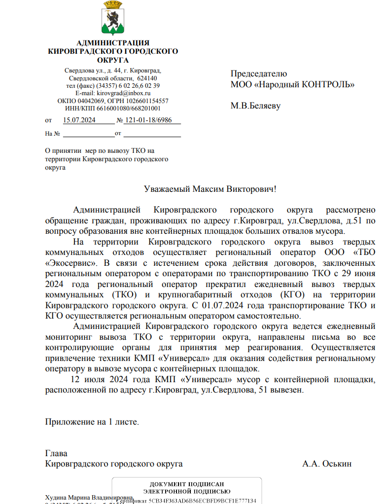 Ответ из Кировграда по вопросу вывоза ТКО по ул. Свердлова