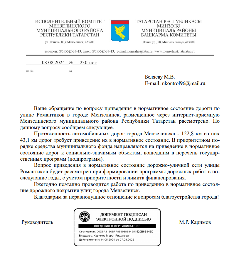 Ответ из Мензелинска по вопросу ремонта дороги по ул. Романтиков