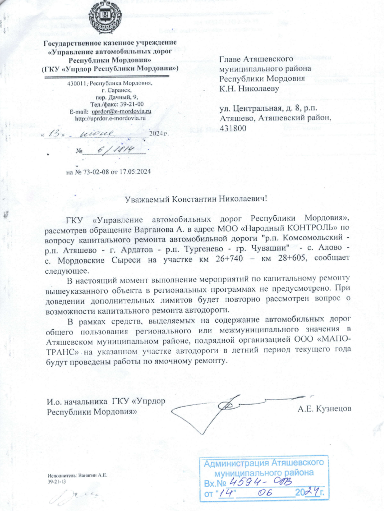 ГКУ «Управление автомобильных дорог Республики Мордовия», рассмотрев обращение Варганова А. в адрес МОО «Народный КОНТРОЛЬ» по вопросу капитального ремонта автомобильной дороги «р.п. Комсомольский — р.п. Атяшево — г. Ардатов — р.п. Тургенево — гр. Чувашии» — с. Алово -с. Мордовские Сыреси на участке км 26+740 — км 28+605, сообщает следующее.
