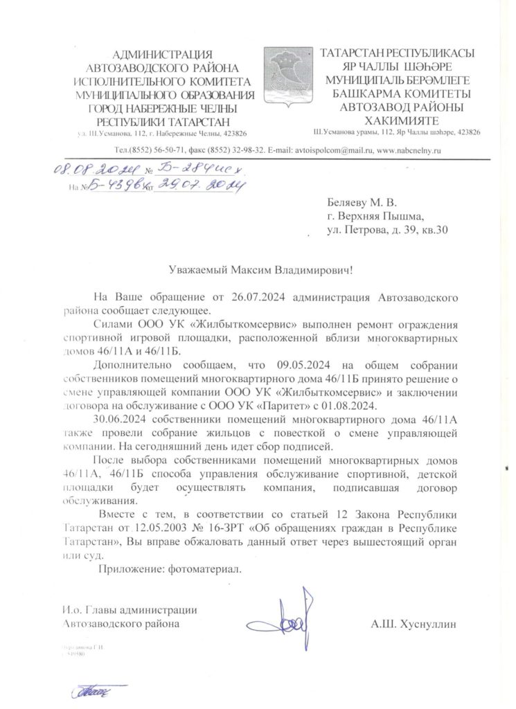 Публикуем ранее поступивший ответ по обращению жителей города Набережные Челны республики Татарстан по вопросу ремонта детской площадки
