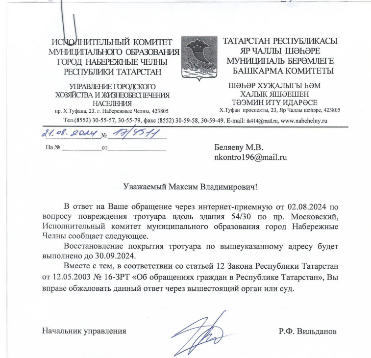 В ответ на Ваше обращение через интернет-приемную от 02.08.2024 по вопросу повреждения тротуара вдоль здания 54/30 по пр. Московский, Исполнительный комитет муниципального образования город Набережные Челны сообщает следующее.