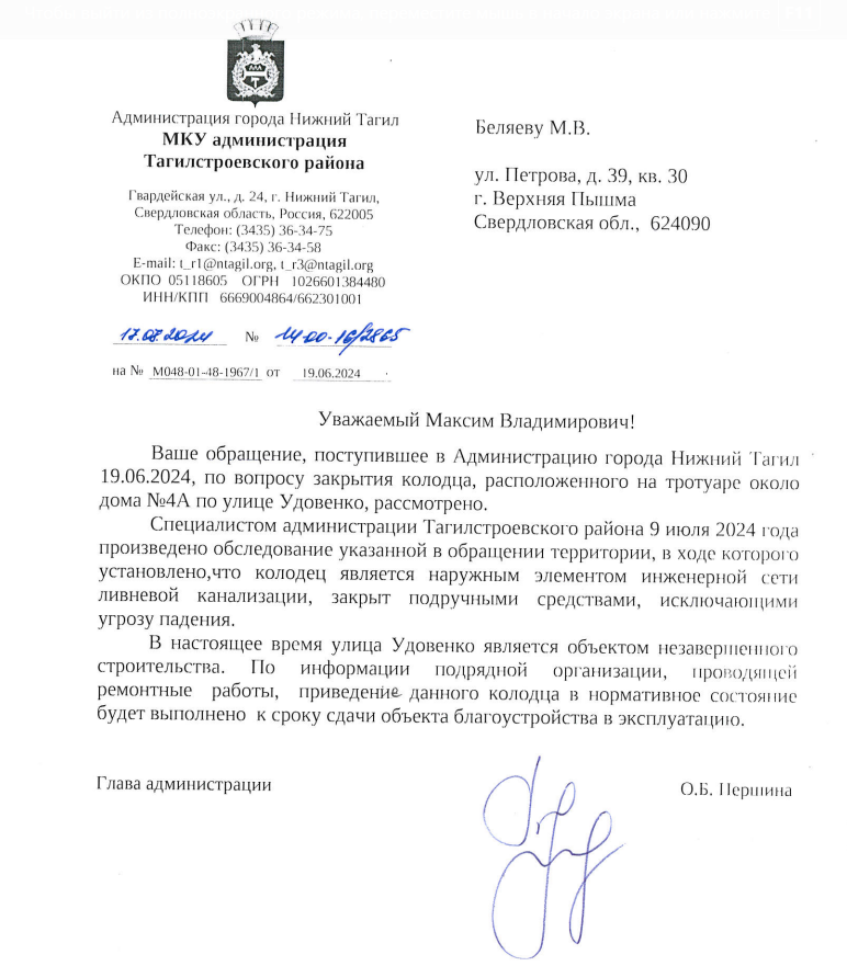 Ваше обращение, поступившее в Администрацию города Нижний Тагил 19.06.2024, по вопросу закрытия колодца, расположенного на тротуаре около дома №4А по улице Удовенко, рассмотрено.